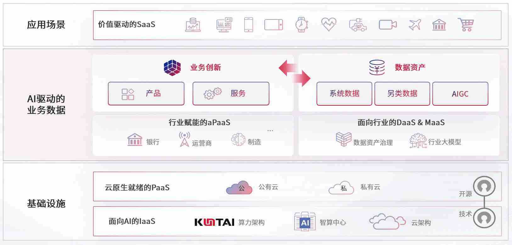 数字时代,,,围绕企业数字化转型的关键要素,,,z6尊龙旗舰厅数码开创性的提出数云融合战略和技术体系框架,,着力在云原生、、、、数字原生、、、、AI原生和信创产业上架构产品和服务能力,,,为处在不同数字化转型阶段的快消零售、、汽车、、、金融、、、、医疗、、政企、、教育、、、运营商等行业客户提供泛在的敏捷IT能力和融合的数据驱动能力,,,构建跨界融合创新的数字业务场景和新业务模式,,助力企业级客户建立面向未来的核心能力和竞争优势,,全面推动社会的数字化、、智能化转型升级。。
