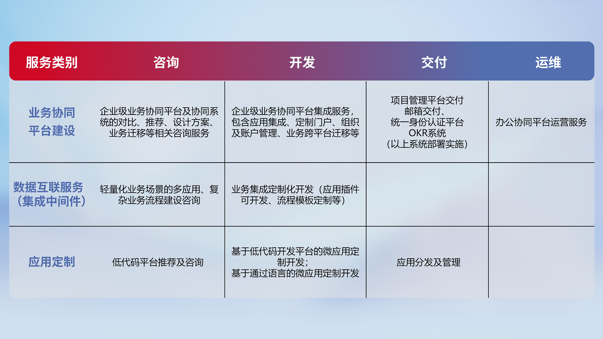 针对钉钉、、企微、、IDaas等平台级产品提供产品的规划、、、、方案、、、交付、、定制化开发等服务,,,实现如统一协同办公、、、智能客户服务、、混合会议管理、、、智能数据查询、、、、等业务场景,,,实现数字化转型。。。
