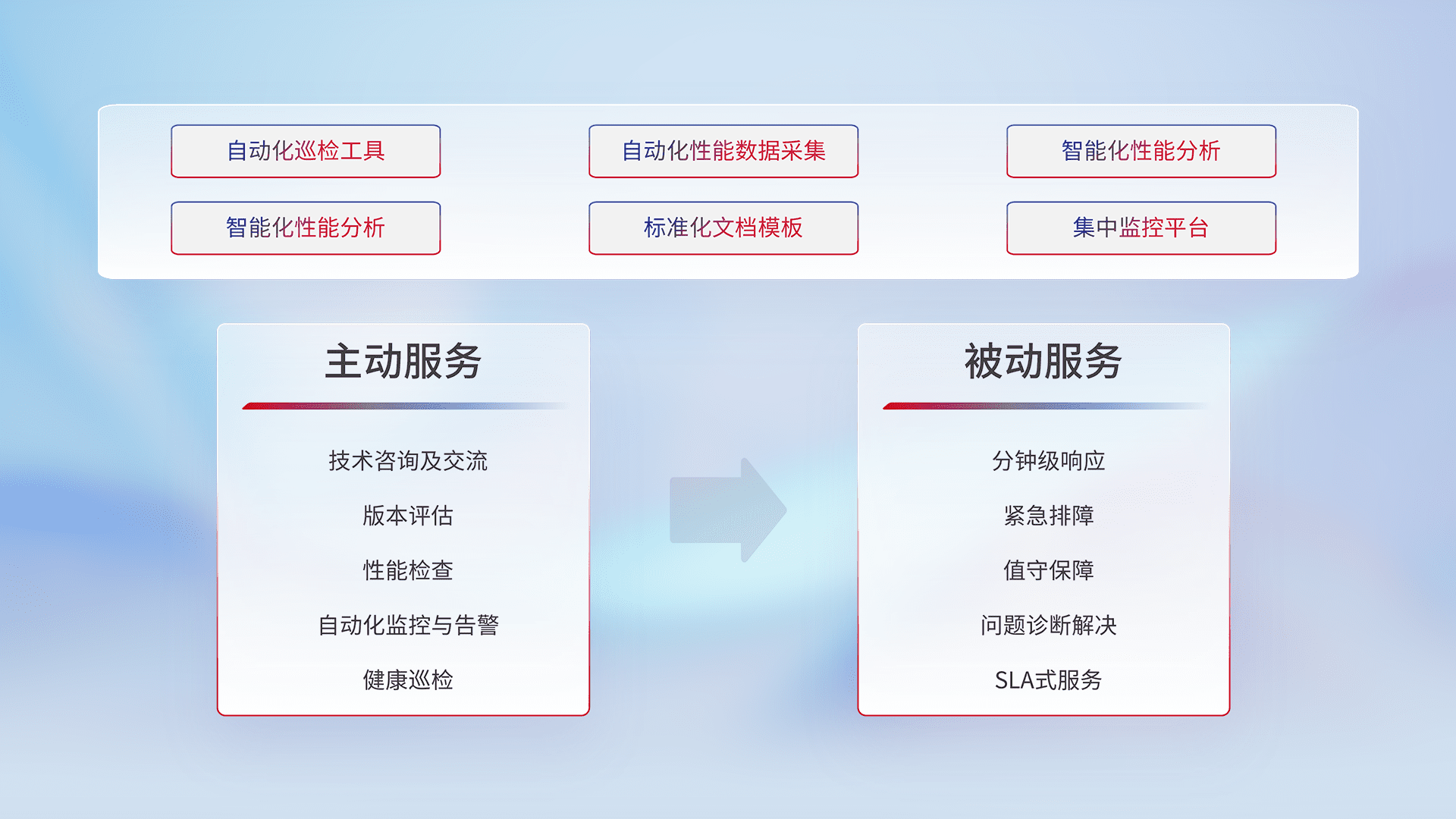 智能化工具和标准化文档,,,保障服务质量,,,提供主动服务(包含技术咨询、、、版本评估、、、、性能检查、、、自动化监控与告警、、、健康巡检)和被动服务包含(分钟级响应、、紧急排障、、、值守保障、、、、问题诊断解决、、SLA服务)。。。。